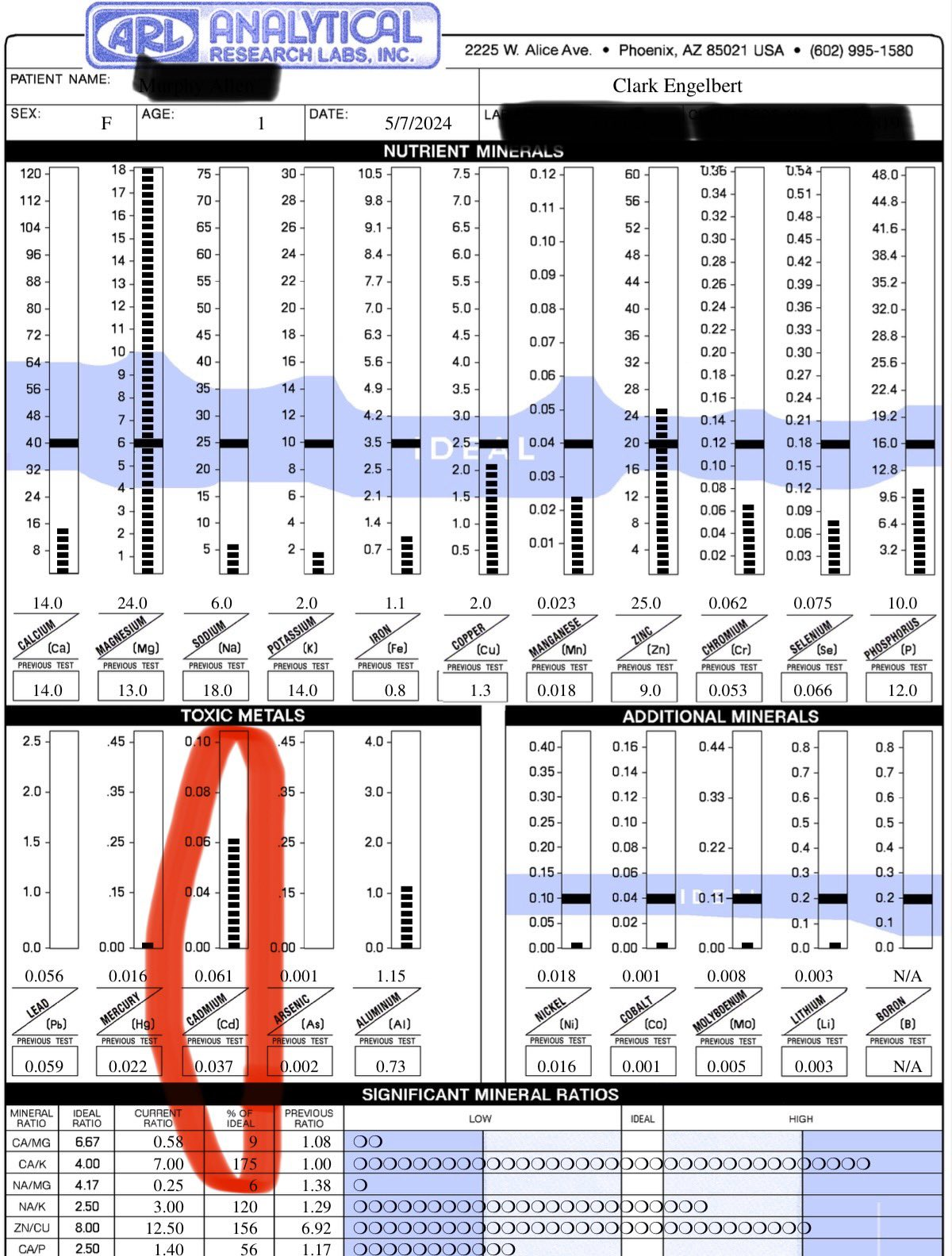 Da sich alle relevanten Mineralstoffverhältnisse verbessert haben und auch der Zink- und Magnesiumstatus deutlich verbessert wurde, wird Cadmium bei diesem erneuten Test nun wirksam aus den Gewebespeichern entfernt. Ein phänomenales Ergebnis bisher. Kurz bevor wir das Testergebnis erhielten, erhielt ich eine E-Mail von der Mutter, in der sie von einem deutlichen Anstieg des Ferritinwertes berichtete, da das Cadmium ausgeschieden war.