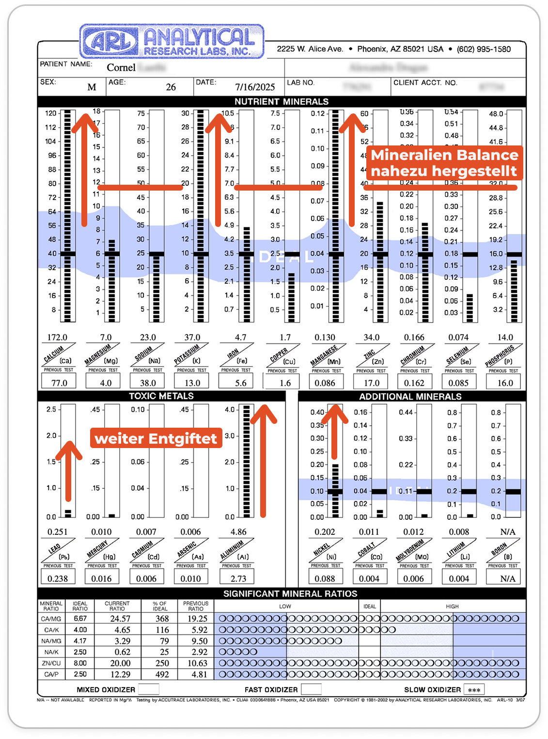 Die zweite Haaranalyse zeigte bereits deutliche Fortschritte. Der Kalziumwert hatte sich normalisiert, was Cornelius als Verlust eines "Schutzschildes" wahrnahm. Interessanterweise sahen wir hier einen Übergang von einer Unterfunktion der Nebenniere und Schilddrüse zu einer Überfunktion.