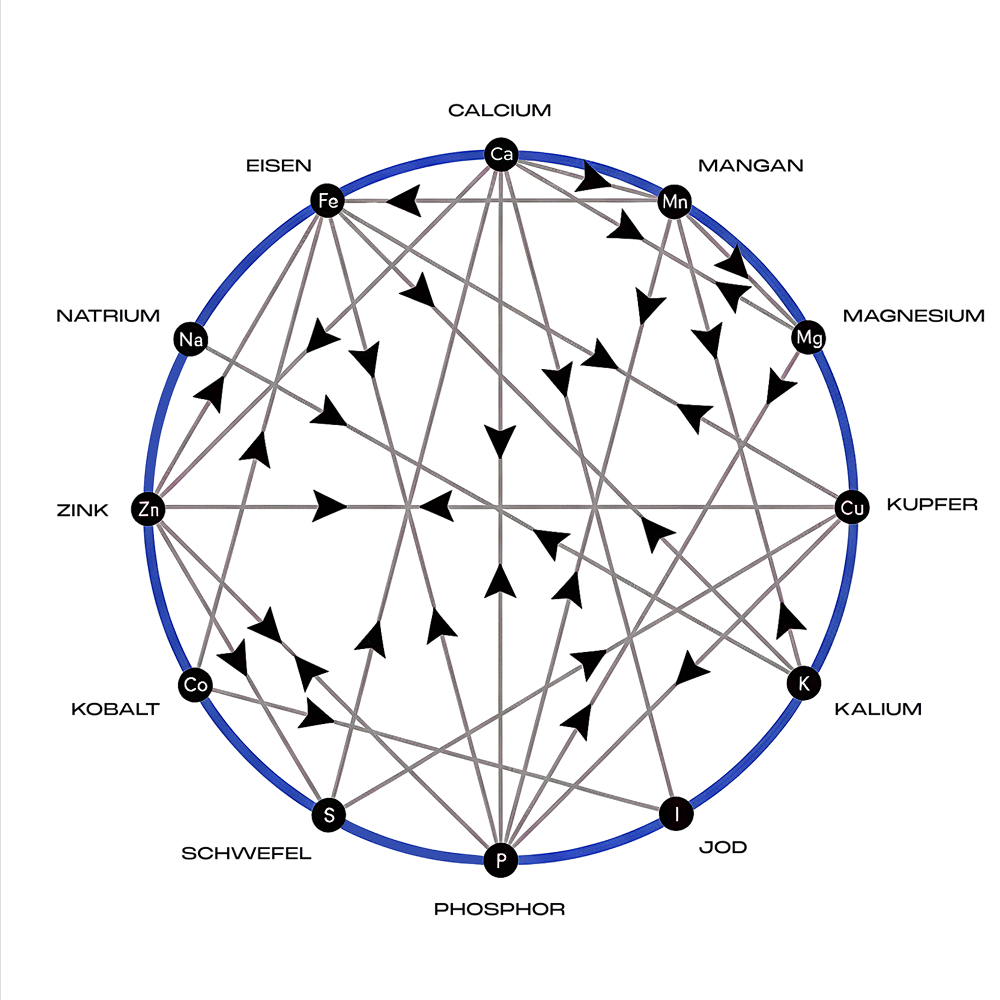 Er fand heraus, dass Ersatztherapie, bei der man einfach ein Nahrungsergänzungsmittel mit dem Mangelmineral einnimmt, überhaupt nicht funktioniert. Um zu verstehen, warum das so ist, muss man die Arbeit von William Albrecht PhD, einem weltweit bekannten Bodenkundler des 20. Jahrhunderts, studieren. Albrechts Arbeit baute die Idee eines Mineralsystems im Boden aus. Dieses Mineralsystem besagt, dass jedes Mineral – entsprechend seiner atomaren Struktur – alle anderen Mineralien auf einzigartige und manchmal überraschende Weise beeinflusst. Dieses System gilt ebenso für den menschlichen Körper – es ins Gleichgewicht zu bringen, ist eines der Hauptziele in MNB und einer der stärksten Wege, die menschliche Gesundheit zu verbessern. Das Mineralrad, das du auf dieser Website siehst, ist eine visuelle Darstellung der Wechselwirkungen in diesem Mineralsystem.